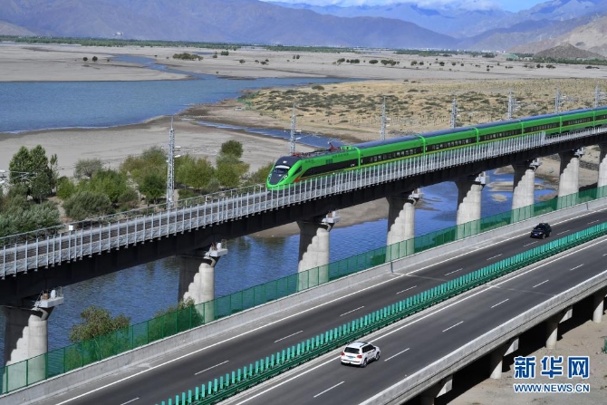 試運(yùn)行的復(fù)興號(hào)列車行駛在雅魯藏布江畔(6月16日攝)。新華社記者 覺果 攝