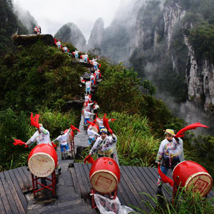 在湖南湘西土家族苗族自治州吉首市德夯天問臺(tái),苗族演員在表演苗鼓舞(2018年10月20日攝)。新華社發(fā)(姚方 攝)