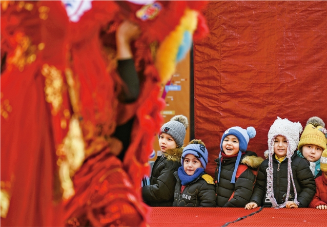 脫貧、全面小康、現(xiàn)代化,一個(gè)民族也不能少。圖為小朋友在新疆烏魯木齊大巴扎步行街觀看元宵節(jié)舞獅表演。 新華社記者 王菲/攝