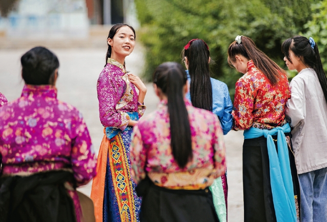 2020年8月6日,青海門源回族自治縣珠固鄉(xiāng)東旭村,村民們身著盛裝準(zhǔn)備去表演鍋莊舞。 中國(guó)文聯(lián)供圖 費(fèi)茂華/攝
