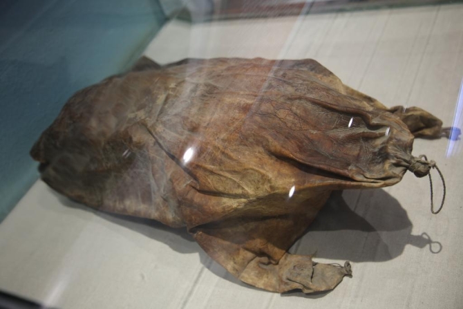 紅軍東征紀念館內(nèi)展陳的國家一級革命文物——羊皮浮筒。(紅軍東征紀念館供圖)