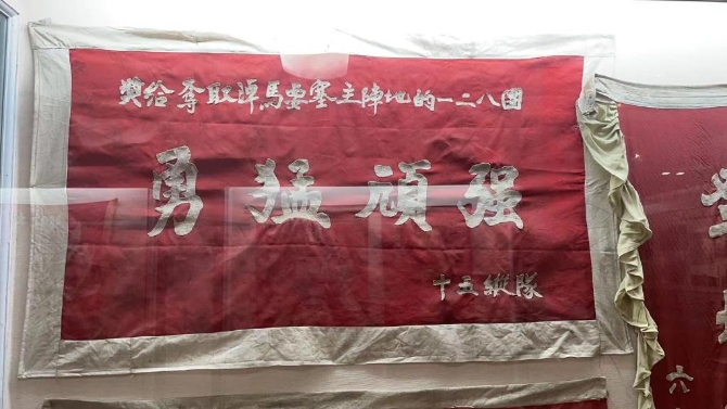 太原解放紀念館展陳的一面獎旗,旗面是用被子面做成。(太原解放紀念館供圖)