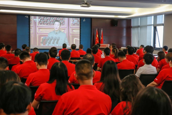 當天,瑞麗航空黨員干部早早地進入5樓培訓室,等待8時在天安門廣場隆重舉行的慶祝中國共產黨成立100周年大會的開幕。觀看大會直播的黨員干部身著紅色文化衫,聚精會神地觀看直播盛況。