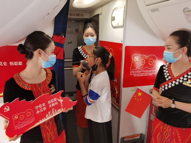 而在DR6579昆明飛往唐山、DR6552昆明飛往無錫的航班上,旅客踏入客艙就感受到了慶祝中國共產黨成立100周年的濃厚氛圍。瑞麗航空有限公司黨委以”奮斗百年路 啟航新征程”為主題將客艙內壁板、行李架、小桌板、頭片裝飾一新,猶如一個小型的流動黨史展館,旅客通過瀏覽感悟中國共產黨的百年奮斗歷程。