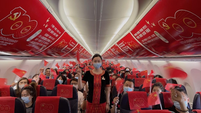當天執(zhí)飛的飛行員、安全員、乘務員均由黨員骨干組成。他們佩戴黨徽,精神飽滿地與同機旅客在萬米高空共同回望黨的奮斗百年路,展望啟航新征程。