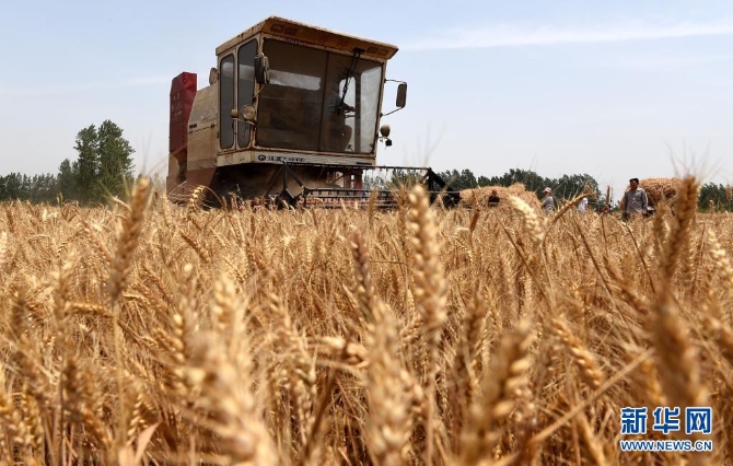 2015年6月6日,一輛聯(lián)合收割機在河南省開封市尉氏縣張市鎮(zhèn)王崗村的麥田里作業(yè)。新華社記者 李博 攝