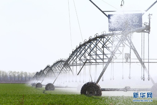 2021年2月23日,在河南省鶴壁市浚縣一片高標準農(nóng)田里,自走式噴灌機在為小麥澆水。新華社記者 許雅楠 攝