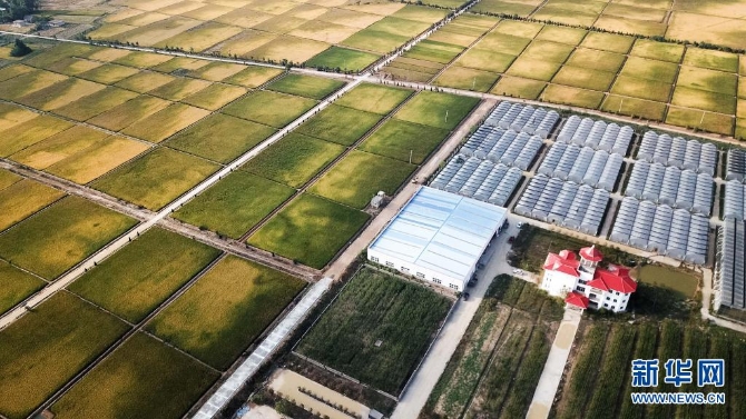這是北大荒集團在安徽小崗村建立的現(xiàn)代化水稻生產(chǎn)基地(2018年9月27日攝,無人機照片)。新華社記者 張端 攝