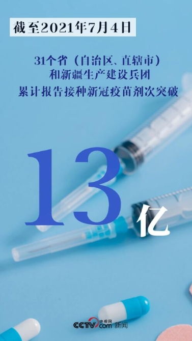 來自國家衛(wèi)生健康委消息,截至2021年7月4日,31個?。ㄗ灾螀^(qū)、直轄市)和新疆生產(chǎn)建設(shè)兵團(tuán)累計報告接種新冠病毒疫苗130549.9萬劑次。