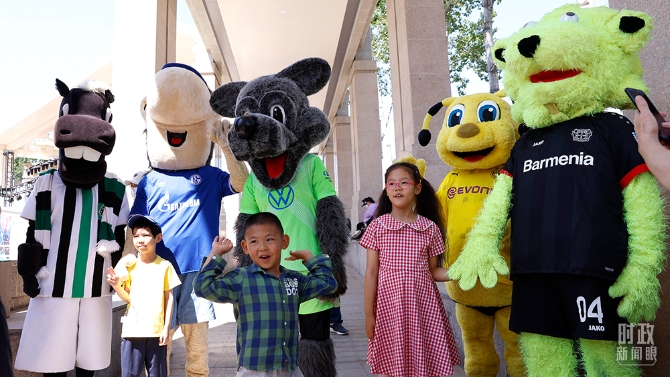 △“走進(jìn)德國 2021北京站”活動今年5月在北京朝陽區(qū)開幕,孩子們與多家德國足球俱樂部的吉祥物合影。(圖/視覺中國)