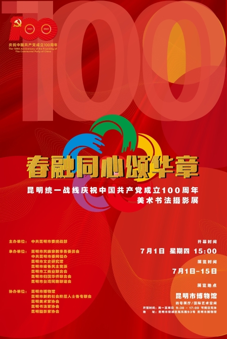 百年征程波瀾壯闊,百年奮斗日月同輝。為慶祝中國(guó)共產(chǎn)黨成立100周年,深入學(xué)習(xí)貫徹習(xí)近平新時(shí)代中國(guó)特色社會(huì)主義思想,深刻總結(jié)黨領(lǐng)導(dǎo)統(tǒng)一戰(zhàn)線的光輝歷史,展示統(tǒng)一戰(zhàn)線廣大成員聽黨話、跟黨走、感黨恩的精神風(fēng)貌,7月1日起至15日,“春融同心頌華章”——昆明統(tǒng)一戰(zhàn)線慶祝中國(guó)共產(chǎn)黨成立100周年美術(shù)書法攝影展在昆明市博物館4號(hào)展廳和國(guó)際藝術(shù)空間隆重舉辦。