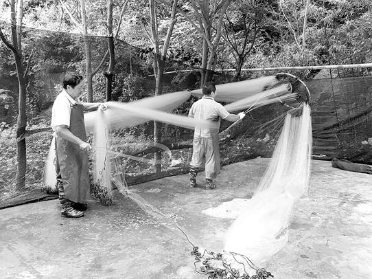 做了充足的準(zhǔn)備后,5日傍晚7時(shí),撫仙湖畔秦家山村的漁民周海亮劃著漁船到撫仙湖里撒網(wǎng)。撒網(wǎng)后,他在湖里睡了一夜,等待次日清晨收網(wǎng)。6日清晨5時(shí),趁著天黑,他一一收網(wǎng),一個(gè)多小時(shí)后,周海亮劃著漁船,載著魚(yú)兒駛向岸邊。此時(shí),家人早已等待在湖邊,他們將粘在網(wǎng)上的銀魚(yú)一一敲下。上午8時(shí),秦家山村子附近的一塊空地上,周海亮和另外一戶漁民正忙著“敲魚(yú)”。周海亮告訴記者,當(dāng)天他家捕獲的銀魚(yú)個(gè)頭小,數(shù)量也不多,他預(yù)計(jì)可賣(mài)到10元/公斤左右。