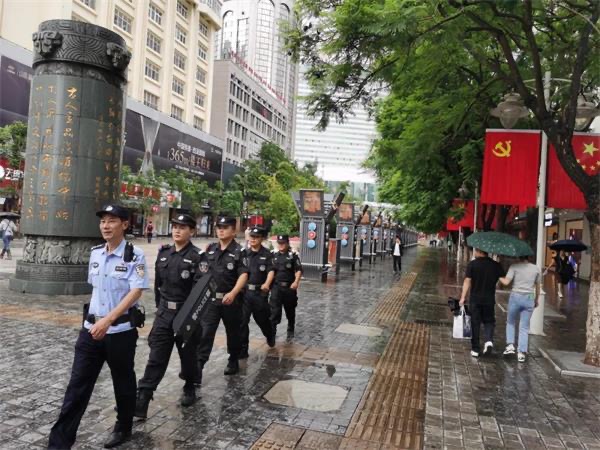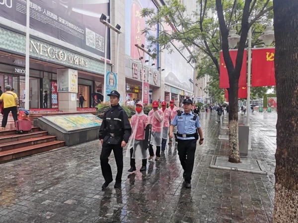 南屏步行街是昆明的中心坐標(biāo),無論是昆明人、還是外地人,或都耳濡目染、或都心馳神往。6月的盛夏,給了南屏街一抹生機(jī)的綠色,沿街的黨旗國(guó)旗迎風(fēng)飄揚(yáng)顯得格外顯眼,街上有身著藍(lán)色、黑色制服的護(hù)國(guó)派出所民輔警,也有頭頂小紅帽、身著紅T恤、手戴紅袖標(biāo)的治安志愿者,他們用“警察藍(lán)”和“志愿紅”與大自然一道,共同為黨和人民繪就了一幅色彩斑斕的平安畫卷。