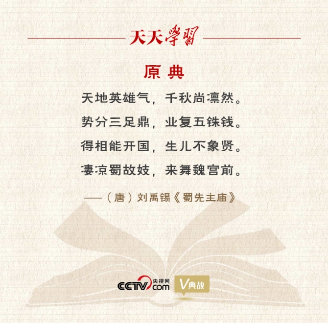“天地英雄氣,千秋尚凜然”出自劉禹錫《蜀先主廟》的首聯(lián)。蜀先主即劉備,蜀先主廟在夔州(今重慶奉節(jié)縣東)白帝山上。劉禹錫曾于公元821—824年間任夔州刺史,該詩當(dāng)作于此時(shí)。這首詠史詩贊揚(yáng)了劉備的功業(yè),總結(jié)了蜀漢亡國(guó)的歷史教訓(xùn),展現(xiàn)了作者的史筆詩才。