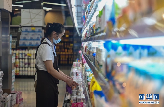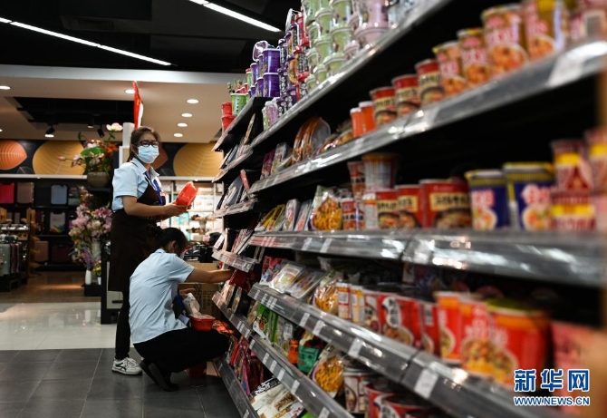 7月7日,工作人員在瑞麗市一家超市內(nèi)整理商品。新華社記者 王冠森 攝