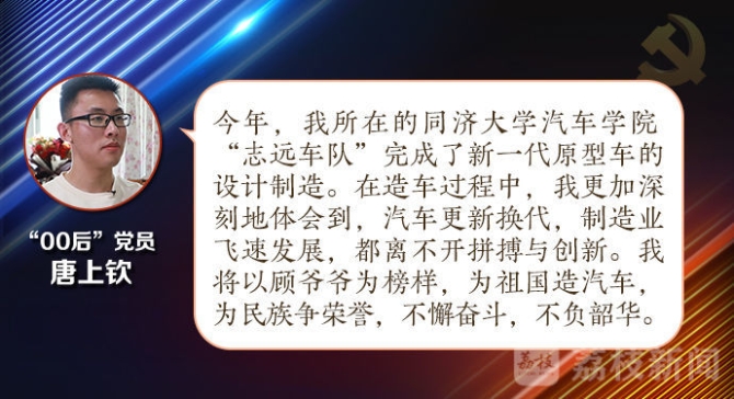 今年剛剛成為預(yù)備黨員的唐上欽,來自同濟大學(xué)汽車學(xué)院,是標(biāo)準(zhǔn)的“00后”,和顧海樓的生長環(huán)境截然不同,他生逢盛世,與新時代同向同行、共同前進。