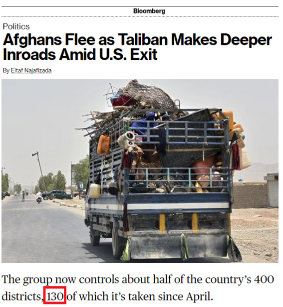 據(jù)彭博社6日?qǐng)?bào)道,塔利班目前已經(jīng)控制阿富汗400個(gè)地區(qū)中的約一半,其中有130個(gè)區(qū)域是4月美國宣布撤軍以來奪取的。