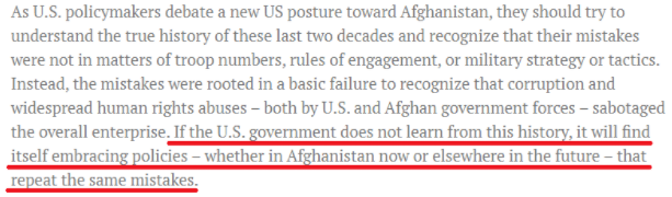 文章稱,在這20年里,美國將短期軍事利益置于建立民主機(jī)構(gòu)和保護(hù)人權(quán)之上,嚴(yán)重削弱了阿富汗政府的軍事和政治能力,使塔利班更容易卷土重來。如果美國政府不從這段歷史中吸取教訓(xùn),它將會(huì)在未來的其他地方重復(fù)同樣的錯(cuò)誤。