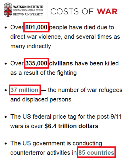 美國布朗大學(xué)“戰(zhàn)爭代價(jià)”項(xiàng)目研究發(fā)現(xiàn),2001年以來,美國以“反恐”之名、花了6.4萬億美元在全球85個(gè)國家發(fā)動(dòng)的戰(zhàn)爭和軍事行動(dòng)奪去了超過80.1萬人的生命,其中平民超過33.5萬人;多達(dá)3700萬人在戰(zhàn)亂中流離失所。