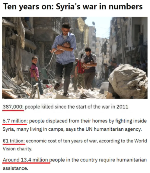 截至去年底,敘利亞危機(jī)已導(dǎo)致38.7萬人死亡,670萬人無家可歸;經(jīng)濟(jì)損失估計(jì)高達(dá)1萬億歐元;約有1340萬人需要人道主義援助。
