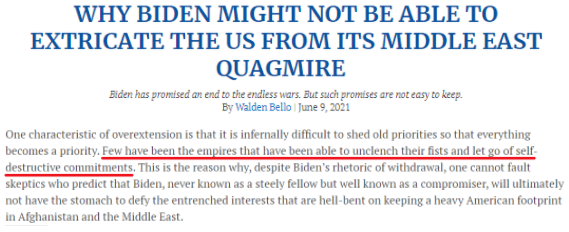 在文章作者看來,美國在中東發(fā)動(dòng)的長達(dá)20年的戰(zhàn)爭導(dǎo)致美國的“帝國權(quán)力”嚴(yán)重衰落,但即使是現(xiàn)在,很多人仍然懷疑美國是否真的吸取了教訓(xùn),因?yàn)椤昂苌儆心膫€(gè)帝國能夠松開拳頭,放棄自我毀滅的執(zhí)念”。