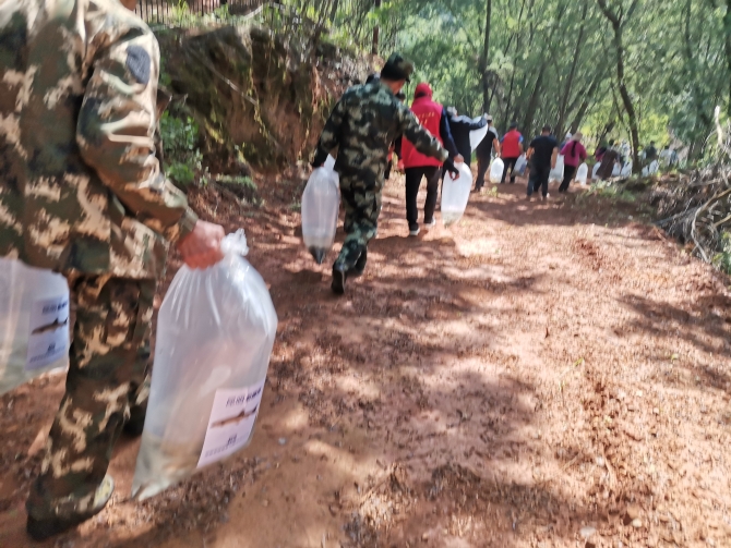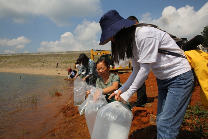 活動(dòng)現(xiàn)場(chǎng),大家把一袋袋魚苗小心翼翼向下傾倒,一條條活蹦亂跳的魚兒躍入水庫(kù),回歸大自然懷抱,為冷水河、牧羊河注入了新的生命和希望。