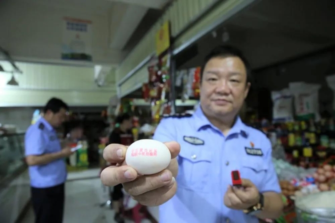 某天,在轄區(qū)菜市場(chǎng),李俊偉看到老人們菜籃子里的雞蛋,想到了辦法。他要做“反詐蛋”,將預(yù)防電信網(wǎng)絡(luò)詐騙標(biāo)語(yǔ)、電信網(wǎng)絡(luò)詐騙的危害寫在雞蛋上,讓群眾帶回家。于是一條一條宣傳標(biāo)語(yǔ)被印章蓋在了雞蛋上。