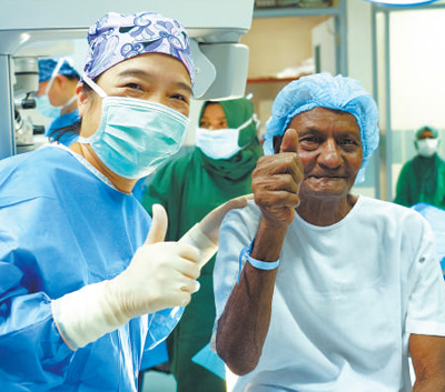 在馬爾代夫首都馬累附近的胡魯馬累醫(yī)院,當(dāng)?shù)乩先耍ㄓ遥┏晒邮苁中g(shù)后,豎起大拇指感謝中國眼科醫(yī)療隊(duì)。新華社發(fā)