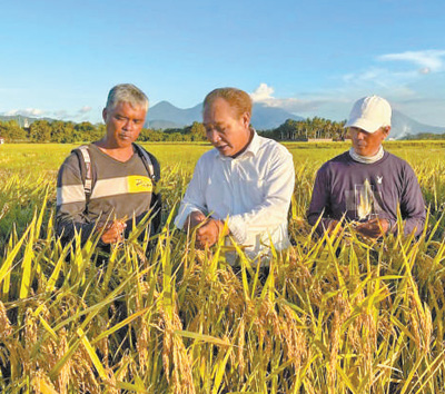 在菲律賓西嶺熱帶雜交水稻研究中心的試驗(yàn)田內(nèi),中國雜交水稻育種專家(中)和當(dāng)?shù)剞r(nóng)民一起查看水稻生長情況。菲律賓西嶺熱帶雜交水稻研究中心供圖