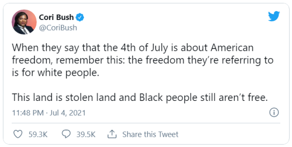 沃特斯的這番言論,出自其主持的一檔視頻訪談節(jié)目中。事情的起因,是美國(guó)國(guó)會(huì)議員、黑人社會(huì)活動(dòng)家克里·布什在美國(guó)獨(dú)立日當(dāng)天發(fā)布了一條推文,稱“這天所代表的美國(guó)自由,是屬于白人的”,并稱“美國(guó)的土地是從原住民那偷來(lái)的,美國(guó)黑人還沒(méi)有贏得自由”。