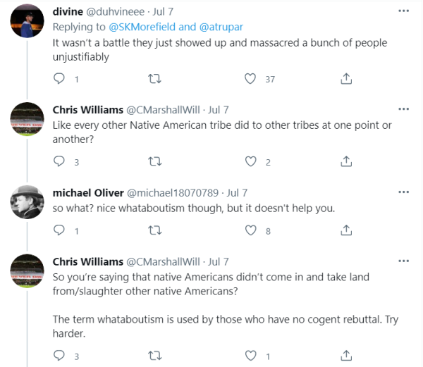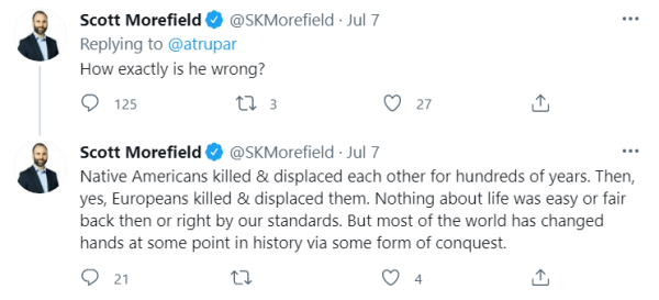 7月6日,美國(guó)??怂剐侣勚鞒秩私芪鳌の痔厮乖诠?jié)目上宣稱:“我們沒(méi)有偷原住民的土地,這是我們打仗贏回來(lái)的!”隨后,這一赤裸裸的支持種族主義、殖民主義的言論,在美國(guó)網(wǎng)絡(luò)界引發(fā)了激烈爭(zhēng)論。