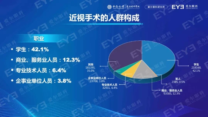 “事實上,這個數(shù)據(jù)一定程度上反映了臨床現(xiàn)狀。學(xué)生人群中,由于征兵入伍、公務(wù)員考試等職業(yè)類需求,男性居多;而女性對顏值、生活品質(zhì)等要求更高,因此上班族中,女性選擇近視手術(shù)的意愿還是比較強(qiáng)烈。”在面對現(xiàn)場媒體的提問時,全球ICL杰出青年醫(yī)師、昆明愛爾眼科醫(yī)院副院長孫鵬說道。