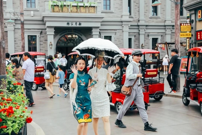 寧波方特東方欲曉通過復(fù)古建筑、布景、主題演藝和年代美陳,精心打造了六大歷史主題區(qū)域,讓游客徜徉在百年歷史情境中,沉浸式體驗(yàn)近現(xiàn)代時(shí)期獨(dú)具特色的社會(huì)風(fēng)貌和人文風(fēng)情。一位擁有百萬粉絲的視頻博主在游玩后表示:“園區(qū)的景觀都非常有特色,充滿京韻的北平街,重現(xiàn)十里洋場(chǎng)繁華的上海街,紅色氛圍濃厚的延安街,讓我感覺像是坐上時(shí)光機(jī)器回到了祖輩們的年代?!?/p>