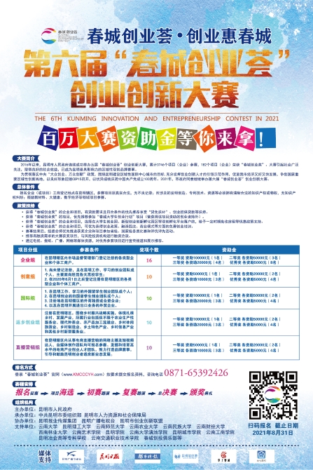 第六屆“春城創(chuàng)業(yè)薈”創(chuàng)業(yè)創(chuàng)新大賽將突出昆明特色,圍繞昆明建設(shè)區(qū)域性國際中心城市的目標(biāo),突出“十四五”產(chǎn)業(yè)發(fā)展規(guī)劃和“中國春城、歷史文化名城、國際大健康名城”三大城市品牌打造,通過大賽培樹創(chuàng)業(yè)典型、表彰創(chuàng)業(yè)先進(jìn),發(fā)揮人才的引領(lǐng)示范作用,引導(dǎo)社會(huì)資源支持創(chuàng)業(yè)創(chuàng)新,鼓勵(lì)更多社會(huì)主體參與創(chuàng)業(yè)創(chuàng)新,激發(fā)全市青年創(chuàng)業(yè)創(chuàng)新熱情,營造良好的創(chuàng)業(yè)創(chuàng)新生態(tài)環(huán)境,努力打造國家重要區(qū)域性創(chuàng)新高地。