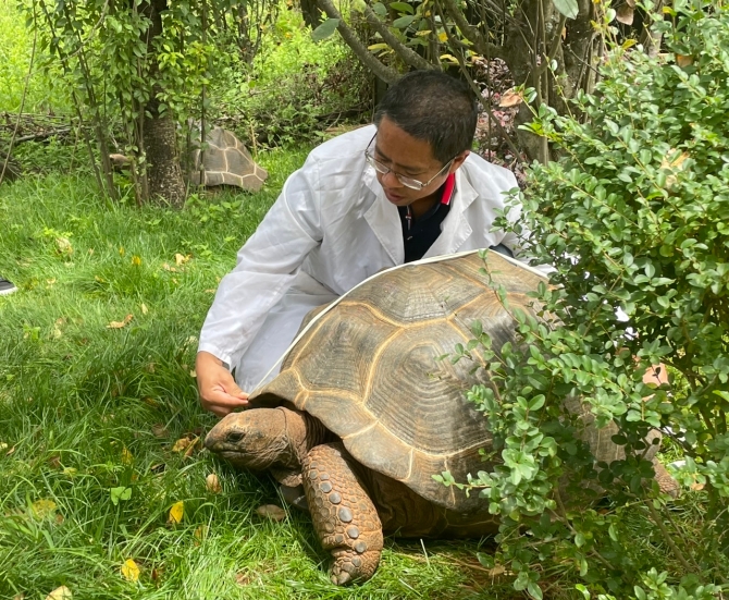 體檢中,獸醫(yī)首先從象龜?shù)耐獗硖卣鏖_(kāi)始檢查,分別測(cè)量了前后腿維、背甲長(zhǎng)度、腰圍,緊接著又將象龜引導(dǎo)至體重秤上檢查體重。隨后,獸醫(yī)對(duì)象龜?shù)目谇贿M(jìn)行了檢查,用手電筒檢查了龜殼的縫隙,并用試管將象龜糞便進(jìn)行采樣,帶回獸醫(yī)院后化驗(yàn)分析,以進(jìn)一步判斷象龜?shù)纳眢w情況。