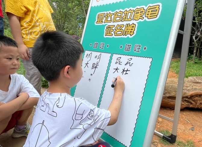 此外,即日起,云南野生動(dòng)物園邀游客為兩只象龜起名?!澳仙?、東海;大胖、大壯;昆昆、明明;長(zhǎng)命、百歲……”現(xiàn)場(chǎng),游客們拿起筆紛紛為象龜起名。據(jù)介紹,游客們還可在云南野生動(dòng)物園的官方微信公眾號(hào)上,參與象龜征名活動(dòng),在評(píng)論區(qū)寫(xiě)下象龜?shù)拿?,工作人員將把市民們提供的名字在官方微信公眾號(hào)上開(kāi)展投票活動(dòng),最終被采用的提名者可獲得云南野生動(dòng)物園成人門(mén)票2張(限7月31日前使用)。