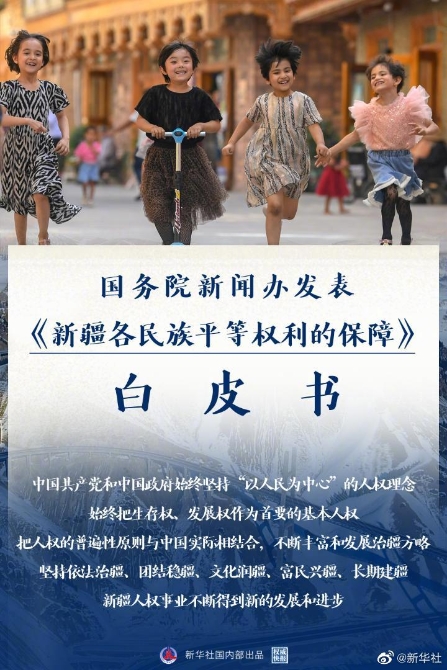 新疆是中國的一塊寶地,新疆各民族是中華民族大家庭血脈相連的家庭成員。1949年,中國共產(chǎn)黨領(lǐng)導(dǎo)各族人民推翻了帝國主義、封建主義和官僚資本主義的統(tǒng)治,建立了中華人民共和國。新疆各族人民同全國人民一道翻身解放,共同當(dāng)家做了主人。70多年來,中國共產(chǎn)黨和中國政府不斷豐富和發(fā)展治疆方略,堅(jiān)持依法治疆、團(tuán)結(jié)穩(wěn)疆、文化潤疆、富民興疆、長(zhǎng)期建疆,新疆人權(quán)事業(yè)不斷得到新的發(fā)展和進(jìn)步。