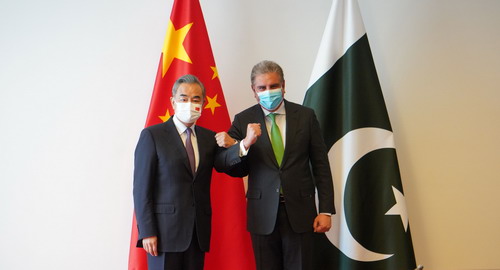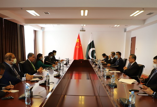 當?shù)貢r間2021年7月14日,國務委員兼外長王毅在杜尚別會見巴基斯坦外長庫雷希。