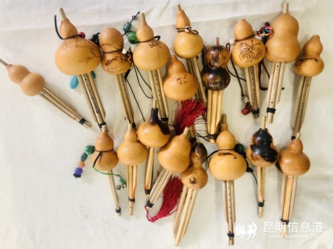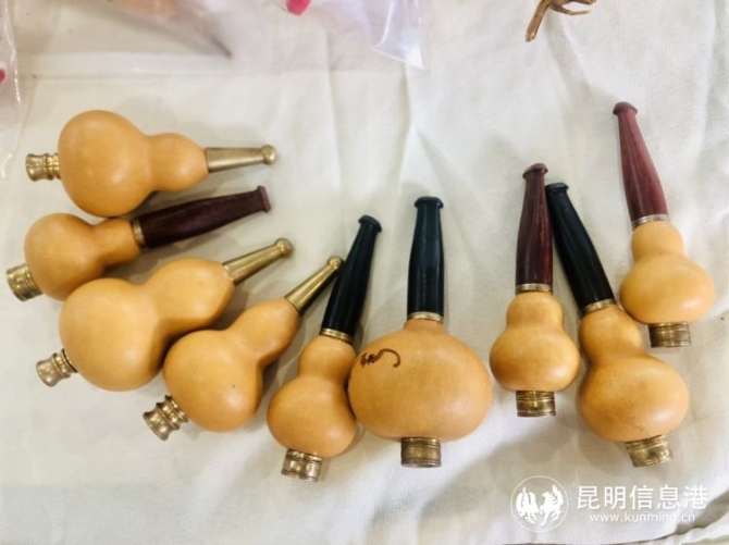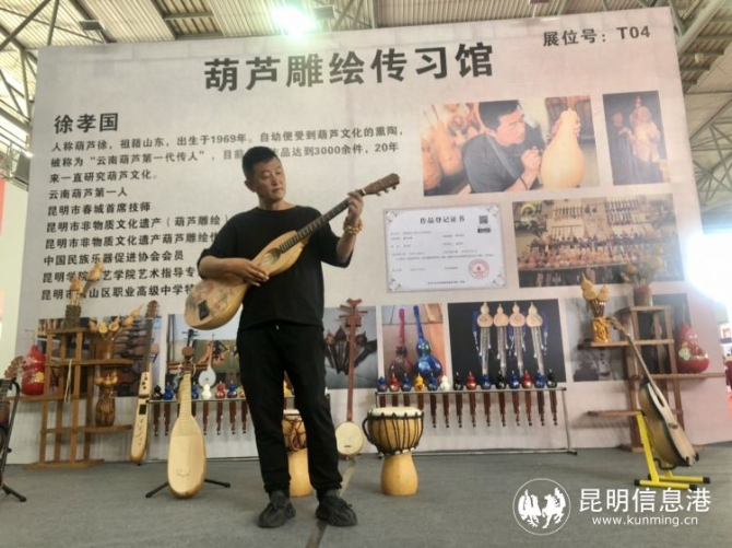 非物質(zhì)文化遺產(chǎn)葫蘆雕繪傳承人徐孝國(guó)也來(lái)到展覽館,吉它葫蘆絲,壓板葫蘆,三弦葫蘆、古箏葫蘆、中阮葫蘆、手鼓葫蘆……由徐孝國(guó)雕繪而成的以葫蘆作為音響體的樂(lè)器受到了社會(huì)各界的喜愛(ài),被中央音樂(lè)學(xué)院指定為云南省葫蘆文化樂(lè)器專用提供商。