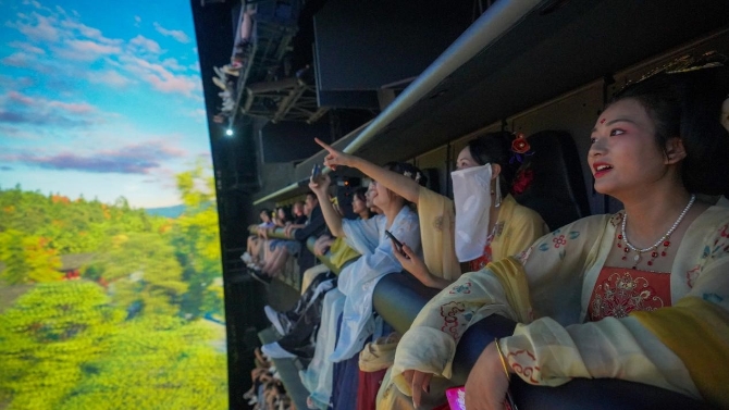 期間眾多全新項(xiàng)目開放博人眼球。大型室內(nèi)Dark Ride表演項(xiàng)目《女媧補(bǔ)天》,逼真的視聽體驗(yàn)、精彩的打斗場面以及隨著曲折的情節(jié)不斷起伏顛簸的“方舟”,引發(fā)現(xiàn)場游客陣陣驚呼;大型劇場表演項(xiàng)目《孟姜女》,虛實(shí)結(jié)合的高科技表演舞臺,為游客呈現(xiàn)出一場氣勢磅礴的視聽盛宴;球幕飛行影院《伴你飛翔》作為方特的王牌項(xiàng)目,以5層樓高的巨幅球幕的電影畫面,呈現(xiàn)出全包圍式虛擬環(huán)境,讓體驗(yàn)者在飛掠名勝古跡、飽覽祖國山水的同時(shí),盡情體驗(yàn)了一把逼真的凌空飛翔感受。