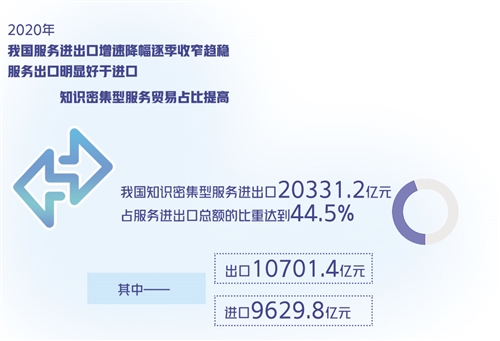 2020年,受新冠肺炎疫情影響,我國傳統(tǒng)服務(wù)貿(mào)易大幅下滑,數(shù)字貿(mào)易逆勢而上,知識密集型服務(wù)進(jìn)出口額為20331.2億元,同比增長8.3%,占服務(wù)進(jìn)出口總額的比重達(dá)到44.5%,提升9.9個百分點(diǎn)。同年,跨境電商進(jìn)出口總額達(dá)1.69萬億元,同比增長31.1%,成為貨物貿(mào)易增長的有力支撐。