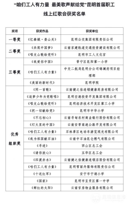 最終,昆明公交集團(tuán)有限責(zé)任公司合唱隊(duì)以一曲《憶秦娥·婁山關(guān)》脫穎而出摘得一等獎(jiǎng),昆明市文化宮、晉寧區(qū)昆陽(yáng)第一小學(xué)等五個(gè)單位的合唱隊(duì)分獲二三等獎(jiǎng),云南健之佳連鎖健康藥房、昆明空港投資開發(fā)集團(tuán)等十五個(gè)單位的合唱隊(duì)榮獲優(yōu)秀組織獎(jiǎng)。