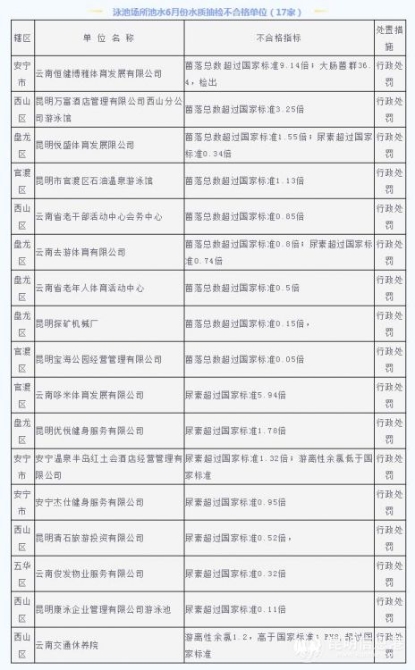 游泳場所池水6月份水質(zhì)抽檢不合格單位(17家)