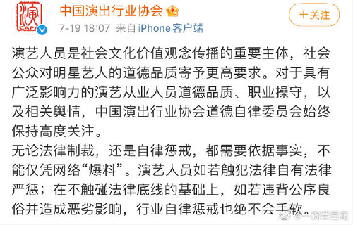 演藝人員是社會文化價值觀念傳播的重要主體,社會公眾對明星藝人的道德品質(zhì)寄予更高要求。針對近日在網(wǎng)絡(luò)上熱度極高的明星話題,中國演出行業(yè)協(xié)會發(fā)文表示,無論法律制裁,還是自律懲戒,都需要依據(jù)事實,不能僅憑網(wǎng)絡(luò)“爆料”。演藝人員如若觸犯法律自有法律嚴(yán)懲;在不觸碰法律底線的基礎(chǔ)上,如若違背公序良俗并造成惡劣影響,行業(yè)自律懲戒也絕不會手軟。