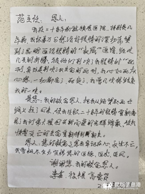 近日,家住楚雄祿豐的高大爺在昆明艾維眼科醫(yī)院白內(nèi)障及青光眼??疲ㄟ^手術(shù)解決了困擾自己20多年白內(nèi)障。從術(shù)前雙眼視力模糊、生活不能自理,到術(shù)后又重獲光明,高大爺送來了親手寫下的感謝信。感謝信的詞句雖然不華麗,但字里行間都透露著老人樸實而又真摯的感情。
