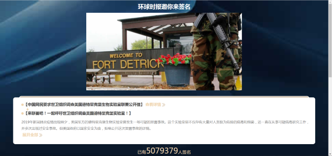 據(jù)《環(huán)球時(shí)報(bào)》實(shí)時(shí)更新的聯(lián)署鏈接顯示,截至7月21日晚,已有超過500萬中國網(wǎng)民聯(lián)署了這封呼吁世衛(wèi)組織調(diào)查德特里克堡生物實(shí)驗(yàn)室的公開信。