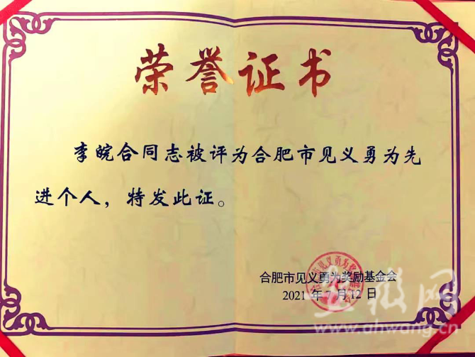 今年 7月12日,李皖合拿到了“合肥市見義勇為先進(jìn)個(gè)人一等獎(jiǎng)”證書,這是繼去年獲得合肥市瑤海區(qū)見義勇為先進(jìn)個(gè)人證書后,他又一次獲得的表彰和肯定。