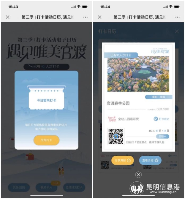作為全新的線上互動(dòng)模式,“遇見唯美官渡”電子打卡日歷以每日打卡集電子卡牌的形式開展。官渡森林公園、王官濕地公園、鳳凰山天文臺(tái)......每張卡牌上不僅有展現(xiàn)官渡美景的照片,還可在相應(yīng)頁面內(nèi)查看打卡地介紹,了解官渡的故事。而電子打卡日歷這一形式也突破了常規(guī),連續(xù)打卡14天收集14張電子卡牌,在傳遞官渡之美的同時(shí),也將調(diào)動(dòng)更多人持續(xù)參與。