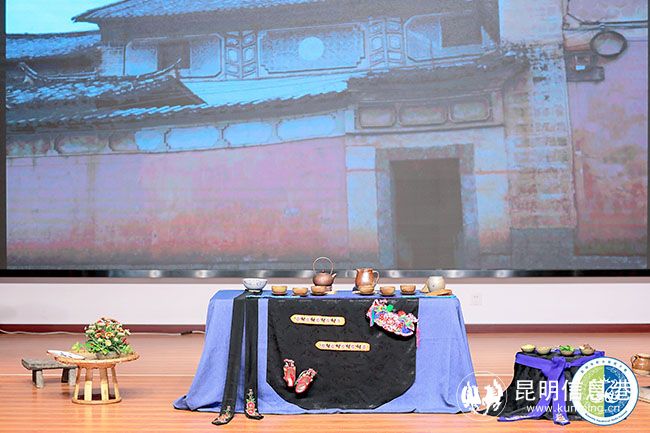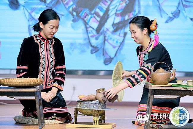 2號選手李珺表演的主題是《云鶴攜思歸》,茶品為曬青綠茶,茶席底鋪藍色亞麻布,上疊鋪白族繡花飄帶;茶席左邊擺放火塘,用來烤茶和煨水;旁邊以簸箕做形,圍腰飄帶搭配上放表演所需配料;茶具采用土陶罐、土陶杯、銅壺和鐵壺。先將陶罐在炭火上烤熱,再將茶葉放入陶罐中烘烤,烤茶講究手法,抖、轉(zhuǎn)、翻、簸,讓茶葉在陶罐內(nèi)均勻地受熱,以防茶葉烤糊。伴著噼里啪啦的聲音陣陣茶香飄出,這時茶便烤好了,將烤好的茶葉取出,沸水注入銅壺,茶與水相互交融,在炭火上繼續(xù)烤煮,茶葉在其中翻騰起舞,好似白族人民的熱情好客。