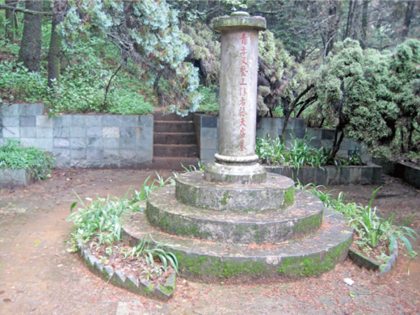 墓為圓形,共三級(jí)石階層層收縮,最上一臺(tái)正中立圓形墓碑,正面是張沖題“青年文藝工作者張?zhí)焯撃?,洱源蕭榮勳書”。